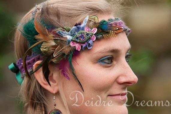 These bridal and festival wear headdresses I created with handdyed and handspun (art) yarns, sometimes around wire, sometimes crocheted. They were adorned with handsculpted polymer clay jewels and vintage millinery flowers and foliage and cruelty-free feathers. Each piece was a unique creation. I still create these on commission.